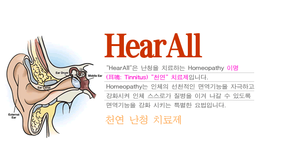 "HearAll"은 난청을 치료하는 Homeopathy 이명 (耳鳴: Tinnitus) "천연" 치료제입니다.