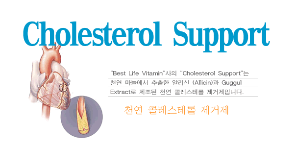 "Best Life Vitamin"사의 "Cholesterol Support"는 천연 마늘에서 추출한 알리신 (Allicin)과 Guggul Extract로 제조된 천연 콜레스테롤 제거제입니다.