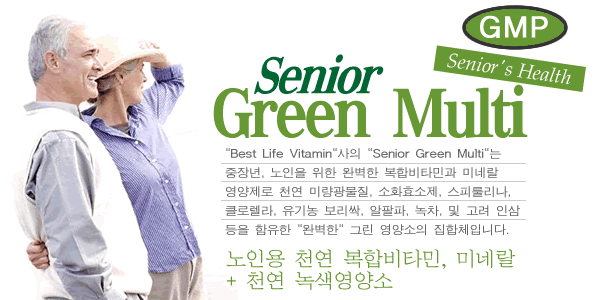 "Best Life Vitamin"사의 "Senior Green Multi"는 중장년, 노인을 위한 완벽한 복합비타민과 미네랄 영양제로 천연 미량광물질, 소화효소제, 스피룰리나, 클로렐라, 유기농 보리싹, 알팔파,녹차, 및 고려 인삼 등을 함유한 "완벽한" 그린 영양소의집합체입니다.