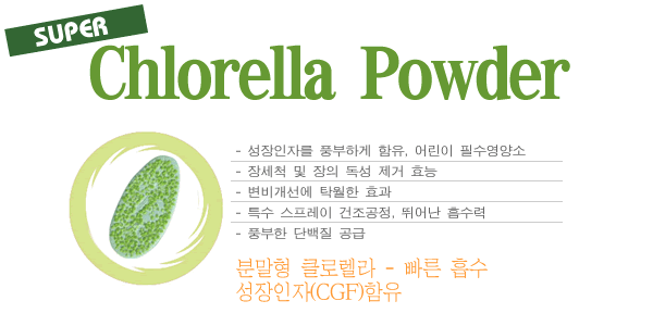 - 클로렐라는 양질의 고 단백질과 엽록소, 베타카로틴 (Beta Carotene) 등이 함유하고 있으며,