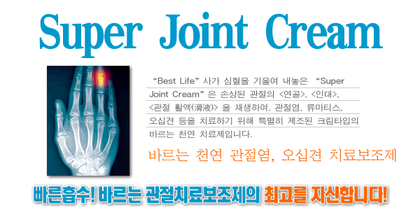 “Best Life”사가 심혈을 기울여 내놓은 “Super Joint Cream”은 손상된 관절의 <연골>, <인대>, <관절 활액(滑液)> 을 재생하여, 관절염, 류마티스, 오십견 등을 치료하기 위해 특별히 제조된 크림타입의 바르는 천연 치료제입니다. 간편한 용기로 바뀌었습니다.