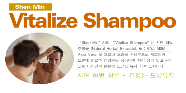 “Shen Min”사의 “Vitalize Shampoo”는 천연 허발 추출물 (Natural Herbal Extracts), 필수오일 (Essential Oils), MSM, Aloe Vera 및 호호바 오일을 주성분으로 제조되어 모발에 필요한 영양분을 공급하여 항상 생기 있고 윤기 있는 머리결과 튼튼한 모근을 유지 시켜 드립니다.