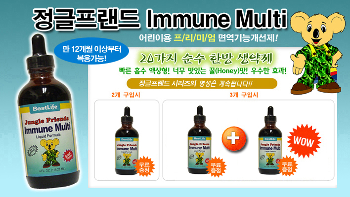 ▲ "Best Life Vitamin"사의 "정글프랜드 시리즈 - 임뮨멀티 (액상형)" 는 20가지 순수 천연 생약제 (Herbs)로 제조된 "고급형" 유아, 어린이 천연 면역기능 개선제입니다.
