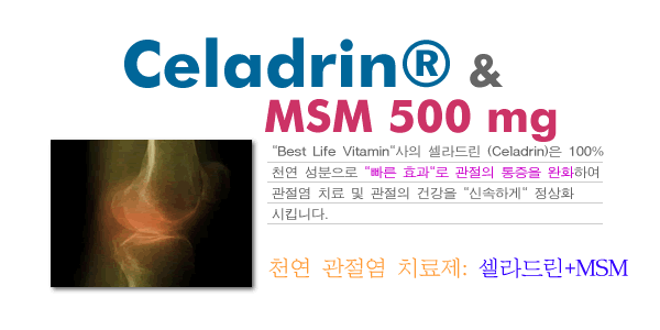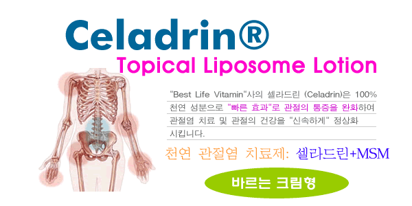 "Best Life Vitamin"사의 셀라드린 (Celadrin®)은 100% 천연 성분으로 "빠른 효과"로 관절의 통증을 완화하여 관절염 치료 및 관절의 건강을 "신속하게" 정상화 시킵니다.