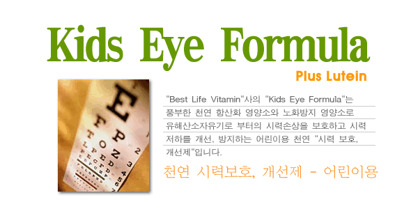 "Best Life Vitamin"사의 "Kids Eye Formula" 천연 루틴, 라이코펜, 케르세틴, 바이오플라보노이드, 타우린, 카로테노이드, 천연 비타민 C, 아연, 셀레늄, 빌베리 등과 시력개선과 보호를 위한 각종 허브를 함유한 어린이 천연 시력 보호, 개선제입니다.