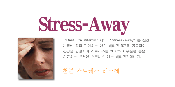1. “Best Life Vitamin”사의 “Stress-Away”는 신경계통에 직접 관여하는 천연 비타민 B군을 공급하여 신경을 안정시켜 스트레스를 해소하고 우울증 등을 치료하는 “천연 스트레스 해소 비타민”입니다.