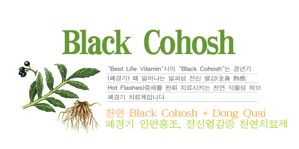 "Best Life Vitamin"사의 "Black Cohosh"는 갱년기(폐경기) 때 일어나는 일과성 전신 열감(全身 熱感; Hot Flashes)증세를 완화 치료시키는 천연 식물성 허브 폐경기 치료제입니다.