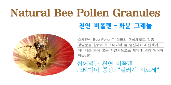 스페인산 Bee Pollen은 식물의 생식세포로 각종 영양분을 함유하여 스태미너 를 증진시키고 인체에 에너지를 불어 넣는 자연제품으로 세계에 널리 알려져 있습니다.
