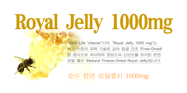 "Best Life Vitamin"사의 "Royal Jelly 1000 mg"는 일벌의 인두선에서 분비되는 분비물을 수집하여 이물질을 제거한 후 최고 수준의 과학 기술로 급속 동결 건조 (Free-Dried)한 방식으로 처리하여 영양소와 신선도를 유지하며, 연질캡슐형으로 되어 있어 복용이 간편한 천연 동결 건조 로얄 젤리 (Natural Freeze-Dried Royal Jelly)입니다.