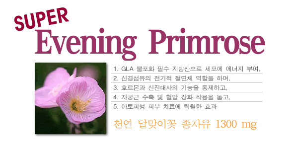 2. 달맞이꽃 (Evening Primrose)은 불포화 필수지방산이 다량으로 함유되어 있다는 과학적 근거가 밝혀졌습니다. 달맞이꽃 (Evening Primrose) 오일에는 리놀렌산 (Linoleic Acid)과 감마 리놀렌산 (GLA; Gamma Linolenic Acid)이 천연적인 형태로 7:1의 비율로 함유되어 있다는 점입니다.